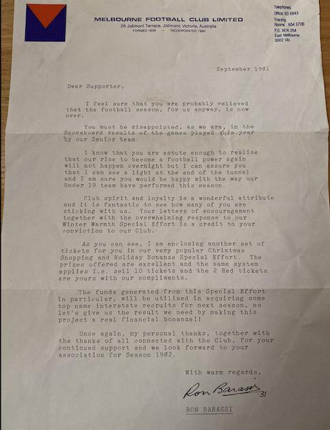 Ron Barassi 1981 Letter